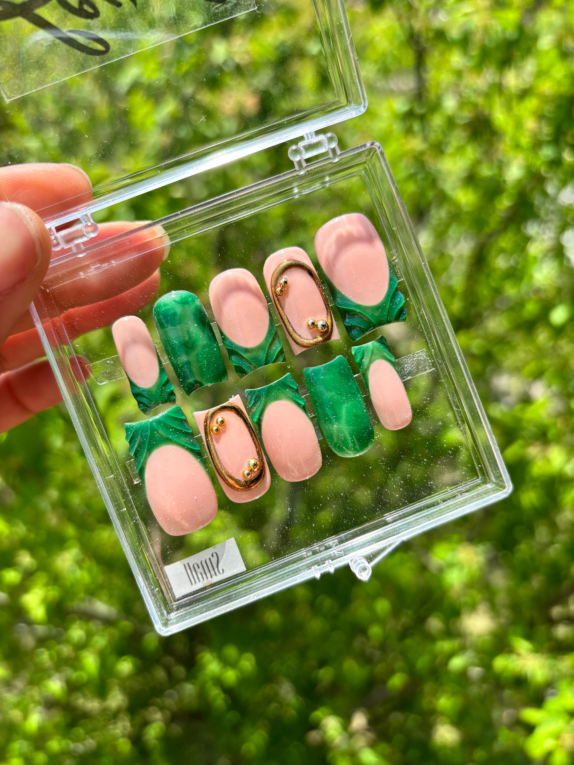 Elevate your nail game with the Gold Emerald French Press on Nails. This stunning accessory is designed to enhance your nail art and style effortlessly.